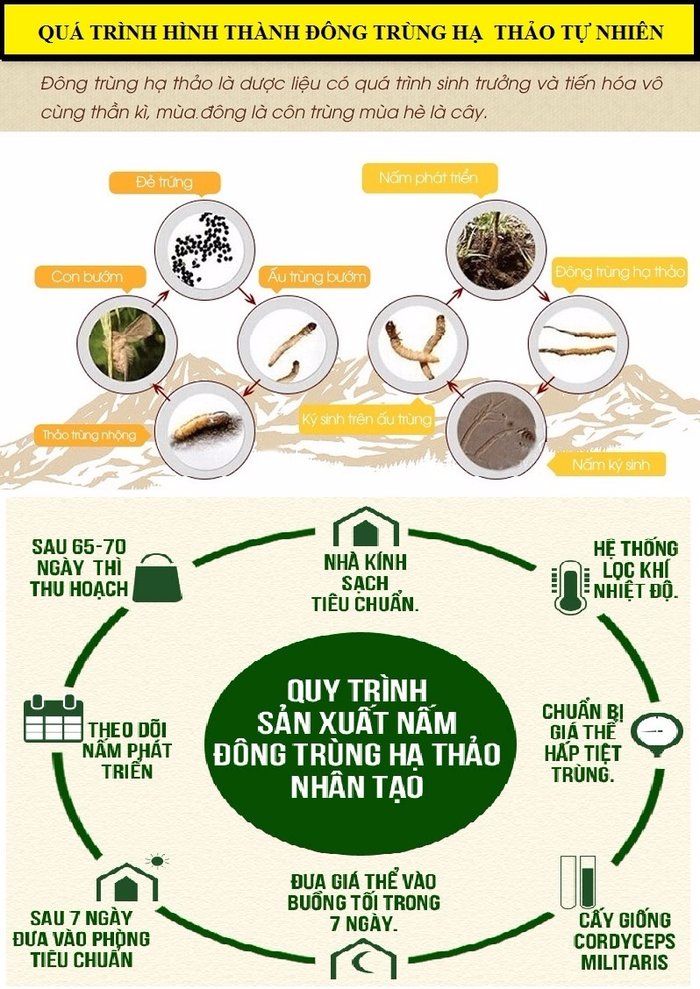 Đông trùng hạ thảo nhân tạo được hình thành do giống nấm Cordyceps kí sinh lên cơ thể sâu non vào mùa đông, hút chất dinh dưỡng của sâu non và ẩn mình trong lòng đất, đến mùa hè nhú lên khỏi mặt đất với hình ngọn cỏ. Đông trùng hạ thảo nhân tạo hình thành bằng cách cấy giống nấm Cordyceps vào ký chủ nhộng tằm và nuôi dưỡng bằng gạo lứt, bột nhộng tằm trong phòng nuôi. |