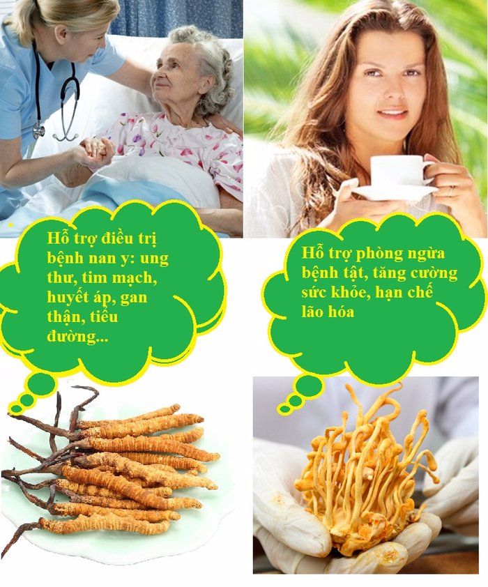 Với các hoạt chất phong phú của mình, đông trùng hạ thảo tự nhiên phù hợp cho việc hỗ trợ điều trị những chứng bệnh nan y và các loại bệnh nặng: ung thư, tim mạch, hỗ trợ chữa các bệnh liên quan đến gan, thận, kiểm soát bệnh tiểu đường, hỗ trợ điều trị các chứng rối loạn sinh dục và suy giảm chức năng sinh dục…
